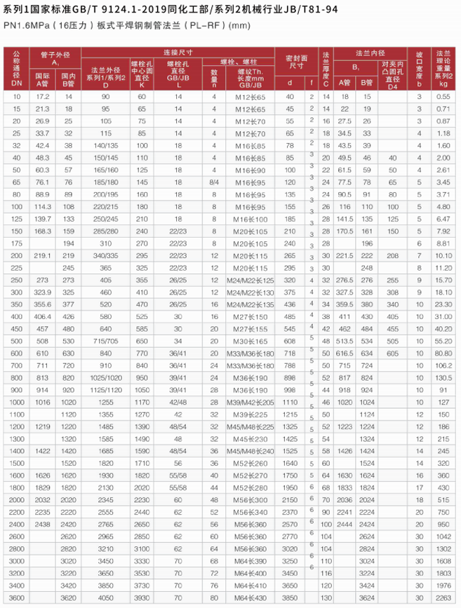 法兰标准表(16压力)